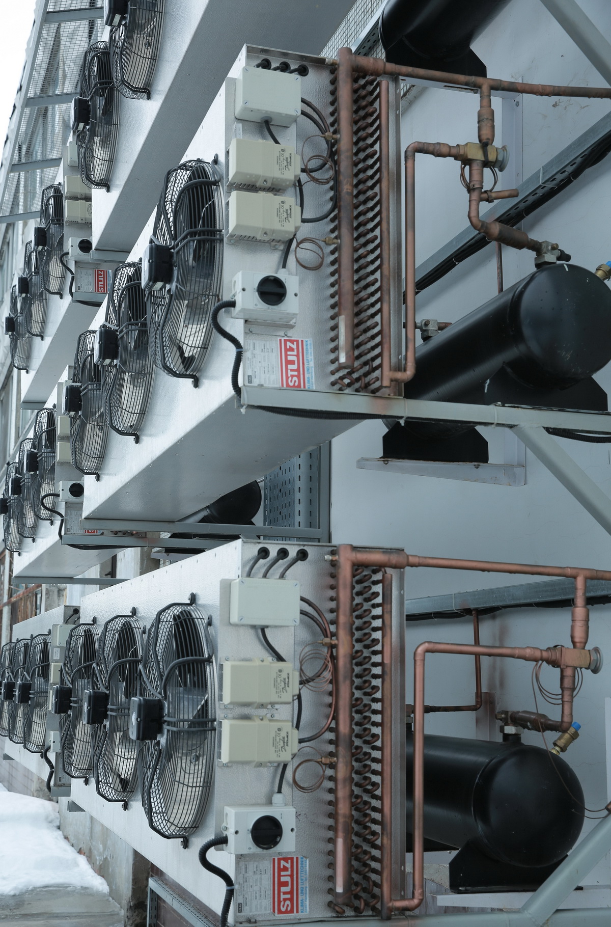 Микроклимат в серверном помещении обеспечивается 19 прецизионными кондиционерами Stulz с подачей холодного воздуха под фальшпол. Система кондиционирования построена с резервированием по схеме N+2.
