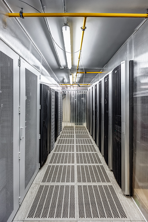 Телекоммуникационные шкафы располагаются параллельными рядами с организацией “горячих” и “холодных” проходов. Такое расположение позволяет обеспечить правильный теплообмен и циркуляцию воздуха внутри кондиционируемой зоны. В “холодных” проходах установлены плиты фальшпола с перфорационными отверстиями для подачи охлажденного воздуха на передние перфорированные двери телекоммуникационных шкафов. Фальшполы имеют нагрузочную способность не менее 800 кг/м². Шкафные кондиционеры подают охлажденный и увлажненный воздух в пространство под фальшполом. Горячий воздух, прошедший шкафы с активным оборудованием и забравший из них избыточное тепло, выбрасывается в горячие коридоры, откуда забирается через верхние решетки шкафных кондиционеров, охлаждается, увлажняется и снова подается в подпольное пространство.
