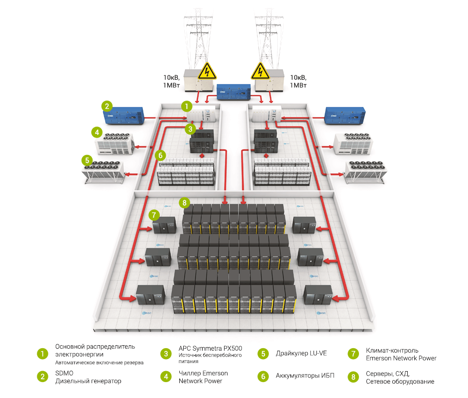 В дата-центре Рига установлены дублированные системы подачи электроэнергии и охлаждения. Системы бесперебойного питания (ИБП) и в режиме ожидания работающие резервные дизельные генераторы способны поддерживать непрерывное питание в случае маловероятного сбоя в подаче электроэнергии.