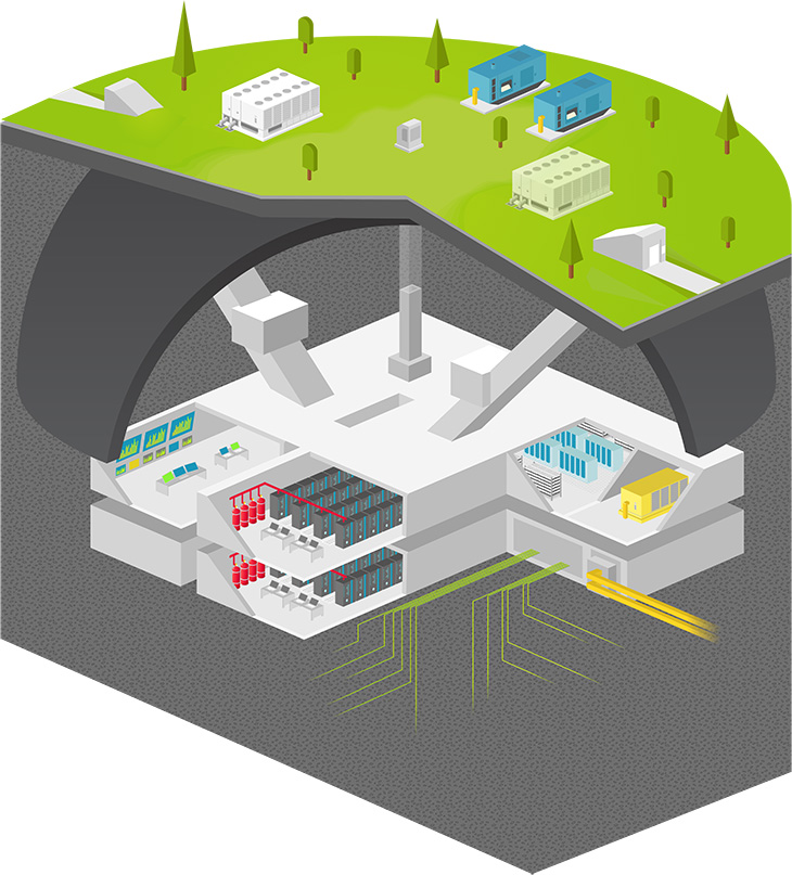 Подземный дата-центр размещен в бывшем армейском командном пункте – бункере, который построен как безопасное строение, благодаря прочным железобетонным конструкциям с многослойным покрытием. Он находится на высоте 9 метров над уровнем моря, но в то же самое время на глубине 12 метров под землей. Такое расположение позволяет избежать как опасности возможного наводнения, так и электромагнитного излучения. Размещенный вокруг всего бункера свинцовый купол толщиной 1,5 метра защищает его от радиации. На объекте обеспечена физическая охрана и видеонаблюдение.