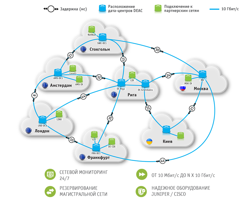 Провайдеронезависимый дата-центр в бункере соединен с несколькими интернет-каналами со скоростью 10 Гбит/сек, которые объединяют множество зарубежных коммуникационных узлов DEAC в Европе, России, Азии, США и других регионах мира. Широко развернутая инфраструктура обеспечивает клиентам доступ с гарантированной скоростью и наиболее низкой задержкой доступа.