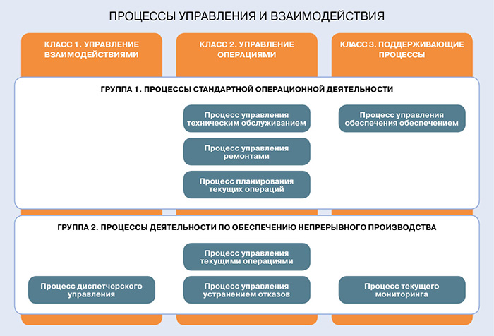 Рис. 2. Классы и группы процессов управления и взаимодействия операционной модели эксплуатации инженерной инфраструктуры ЦОДа
