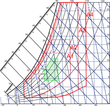 В целом оборудование современных ЦОДов неплохо переносит и более высокую температуру, и увеличение влажности воздуха. В качестве допустимых границ используются параметры, рекомендованные ASHRAE (American Society of Heating, Refrigerating and Air Conditioning Engineers). В первой редакции этих рекомендаций, опубликованной в 2004 г., был установлен верхний предел в 25 градусов Цельсия при влажности 40%, во второй (2008 г.) – 27 градусов при влажности 60%. В рекомендациях 2011 года появились два новых класса оборудования для ЦОДов – А3 и А4 с температурным диапазоном до 40 и 45 градусов. Хотя такое «жаркое» охлаждение еще не распространено повсеместно, любители инноваций активно начинают его использовать. Это позволяет существенно расширить географию применения «зеленого» охлаждения.