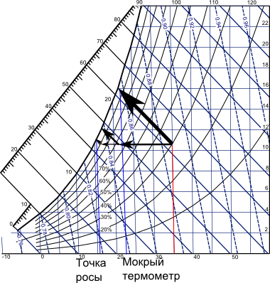 Строго теоретически предел охлаждения в этом процессе заметно ниже и равняется температуре точки росы. Для реализации этой возможности достаточно часть исходного воздуха охладить до температуры мокрого термометра испарением воды, а потом с его помощью охладить остаток, не увлажняя. Далее холодный воздух также увлажняется, приобретая более низкую температуру. Процесс можно повторить еще раз с частью воздуха, достигнув температуры, близкой к точке росы. Единственная очевидная техническая трудность достижения минимально возможной температуры — увеличение в несколько раз требуемых объемов подаваемого воздуха и площади теплообменника.
