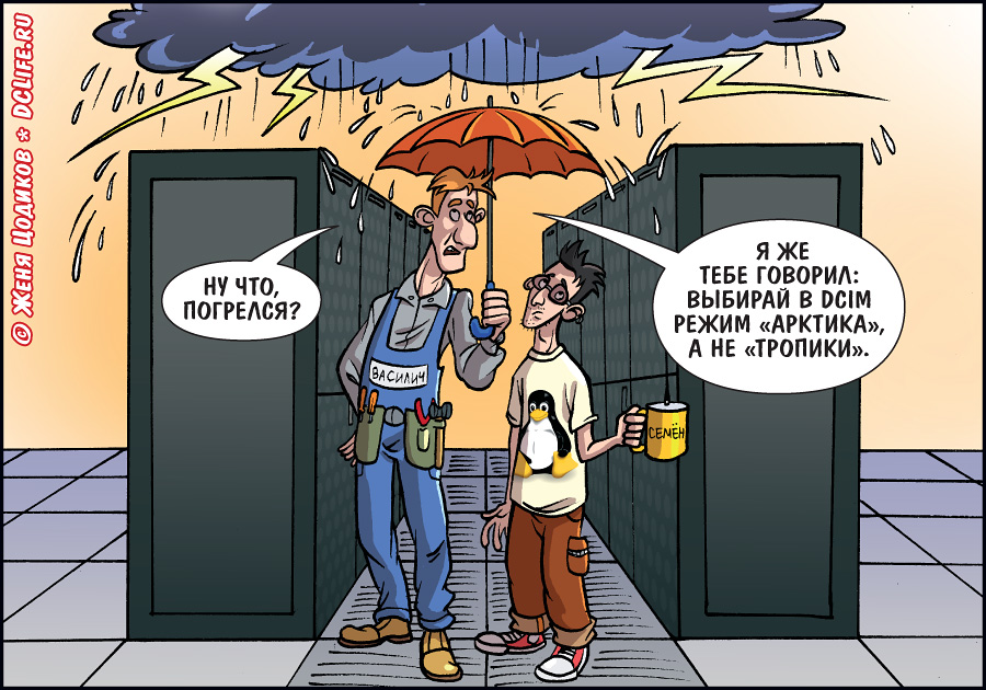 В 2001 г. этот дата-центр столкнулся с проблемой в работе системы управления, из-за чего температура воздуха, используемого для охлаждения серверов, достигла более 26 градусов Цельсия, а влажность - свыше 95%. В результате стал накапливаться конденсат и образовалось дождевое облако, заполнившее собой все пространство с вычислительным оборудованием. В происходящее было невозможно поверить. Начались звонки коллегам в центр эскалации проблем, а те долго не могли вникнуть, о каком дождевом облаке идет речь? Проще было убедить их в том, что яблони зацвели на Марсе, чем в сказку о дожде.