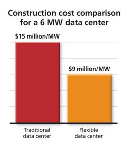 Модульная архитектура позволяет значительно сократить время, необходимое для создания и ввода ЦОД в эксплуатацию. Как следствие, он сможет быстрее начать приносить компании деньги по сравнению со стандартным аналогом. Что касается капитальных расходов, тут модульная архитектура также выигрывает. Средний уровень капитальных затрат в случае традиционной серверной фермы составляет $ 15 млн. из расчета на один мегаватт (график 1). Таким образом строительство дата-центр на 6 МВт для корпоративного использования потребует капитальных затрат в $ 90 млн. В случае модульной конструкции средний уровень капитальных затрат составляет около $ 9 млн. из расчета на один МВт. То есть строительство 6-мегаваттного ЦОД потребует инвестиций на уровне $ 54 млн.