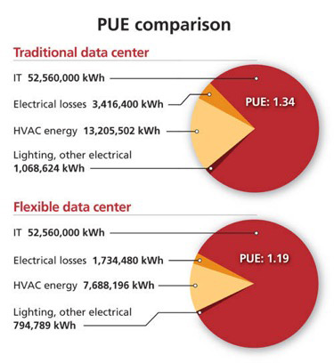Понятно, что возможность добавлять или сокращать вычислительные мощности по мере необходимости позволяет модульному дата-центру использовать меньше электроэнергии, чем обычному ЦОД. Более того, эффективность использования энергии (PUE) в случае модульного дата-центр также ниже (1,19 по сравнению с 1,34, график 2), что указывает на более высокую эффективность по сравнению со стандартной серверной фермой.