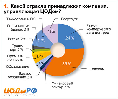 Опрос также показал, что значительная часть ЦОДов находится под контролем операторов связи — об этом сообщили 35 % респондентов. Данный показатель не удивляет, поскольку ЦОДы данного сегмента строятся наиболее активно, к тому же все чаще операторы связи планируют использовать пространство дата-центров не только для своих нужд, но и сдавать площади (или даже ИТ-мощности) в аренду. А вот отсутствие в опросе компаний — эксплуатантов ЦОДов из электронной торговли и медиа, говорит скорее лишь о том, что такие компании предпочитают арендовать ресурсы у коммерческих ЦОДов, не строя собственных или используя облачные технологии (что стало трендом для электронной коммерции).