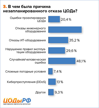 А вот ошибки проектирования значительно снизились: если ранее во многих обзорах они стояли среди первых по частоте, то в нашем обзоре на них указали только 20,4 % представителей компаний. Что ж, культура и детализация проектирования принесли свои плоды. А ведь именно ошибки на стадии проектирования труднее всего и дороже исправлять. В то же самое время хотелось бы отметить еще одну важную деталь: крайне желательно, чтобы сотрудники, занимающие ключевые посты и отвечающие за эксплуатацию, были подключены к процессу строительства ЦОДа еще на стадии проектирования (особенно это касается коммерческих ЦОДов). Тогда бесценный опыт, накопленный при возведении объекта, не будет утерян, а сама реализация ЦОДа будет максимально отвечать не только бизнес-модели, но и согласовываться с рабочими процессами службы эксплуатации.