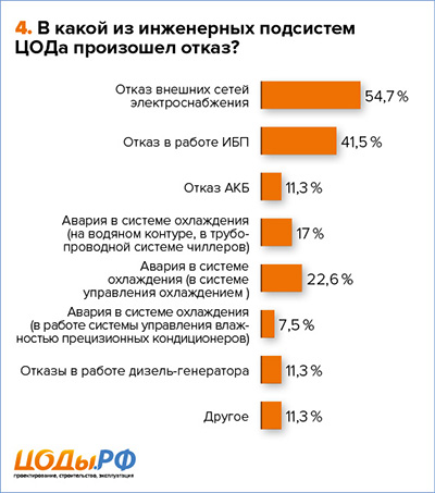 Увидев такой результат, стало интересным разобраться детальнее в этой части: что же именно выходит из строя в самих инженерных системах чаще всего? Статистика показала 94 эпизода, поскольку в некоторых случаях отказывало сразу несколько подсистем. 54,7 % опрошенных сообщили, что отказы связаны с выходом из строя тех или иных элементов системы электроснабжения, 41,5 % — из-за неисправности ИБП, 11,3 % — из-за отказа батарей. А это весьма немало: в среднем — 61 % по вине систем электроснабжения. Добавляем к этой цифре 11,3 % отказов в работе дизель-генераторных установок (ДГУ) и получаем впечатляющие 67 %. Вот и вывод: две трети проблем — из-за гарантированного электроснабжения потребителей!
