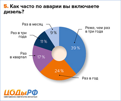Как выяснилось, запуск ДГУ осуществляется довольно редко. Очевидно, характер сбоев не позволяет ДГУ спасти ситуацию или же проблема локализирована внутри сети электроснабжения и не требует запуска ДГУ: только половина опрошенных компаний сообщила, что необходимость запуска дизеля возникает раз в три года или еще реже. Еще около 24 % прибегают к помощи ДГУ только раз в год.