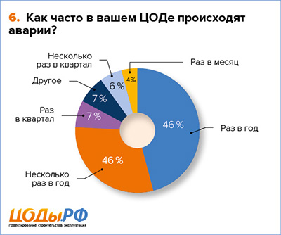 Выяснилось, что 50 (почти 93 %) компаний из 54 опрошенных отмечают, что те или иные отказы происходят как минимум раз в год. Из этих компаний 30 % сообщили, что авария случается несколько раз в год, но только 4 % указали, что аварии случаются раз в месяц и не чаще. То есть можно говорить, что в большинстве дата-центров все-таки хотя бы раз в год авария случается, но не чаще, чем несколько раз.