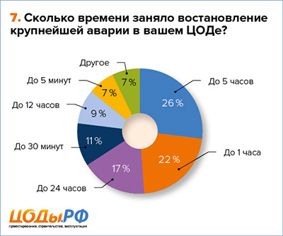 При этом все аварии были устранены достаточно оперативно: ликвидация 93 % аварий уложилась в суточный интервал, из которых почти четверть (26 %) заняла не более пяти часов, а 41 % — и вовсе до часа. При этом речь идет только об авариях, которые стали значительными для участников опроса. Напомним, один из ранее проведенных нами опросов показал: для большинства организаций допустимым временем простоя как раз и является диапазон от получаса до суток. Иными словами, хотя аварии и происходили, но все они были устранены в разумные сроки.