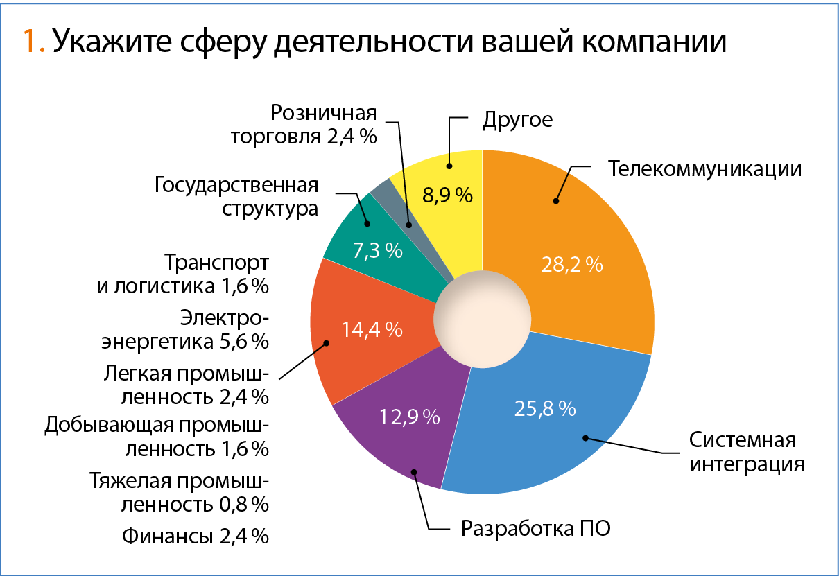 В статистическом исследовании приняли участие 124 респондента, представляющих самые разные сферы деятельности. Больше всего среди опрошенных было телекоммуникационных операторов — 28,2 %, немалая доля системных интеграторов — 25,6 %, и почти 13 % — компании — разработчики ПО. Эти три категории сформировали более 2/3 всех ответов. Что касается представителей остальных 12 направлений, то они распределились более-менее равномерно, и в результате доля каждого из них не составила и 10 %.