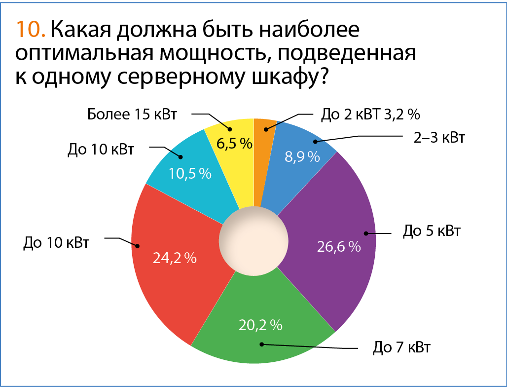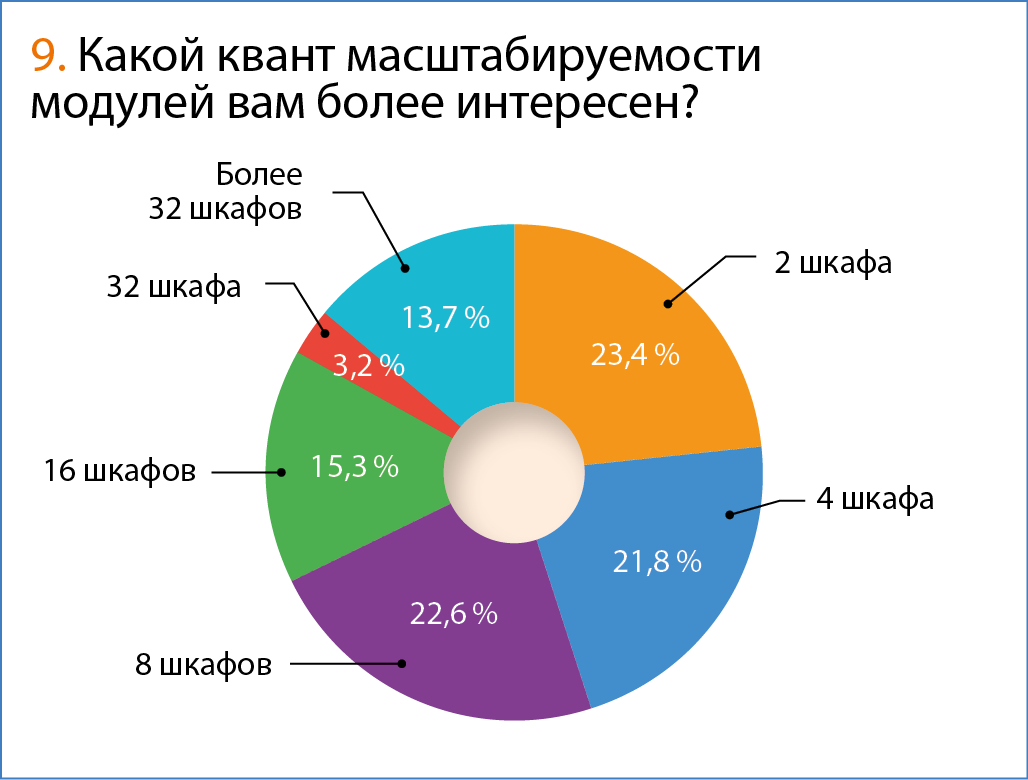 В ответах на вопросы, связанные с ожидаемыми техническими параметрами дата-центров, мнения респондентов разделились. Примерно равное количество участников опроса хотят наращивать свои ЦОДы «квантами» по 2, 4 или 8 шкафов. Но, например, сразу 32 шкафа почти никому не требуется — надо либо больше, либо меньше. Это говорит о том, что в нынешних экономических условиях большинство компаний не рассчитывают на молниеносный рост бизнеса — скорее, на поступательное развитие небольшими «порциями», и здесь модульность будет как нельзя кстати. Причем желательно, чтобы возможность шага изменений была минимальной.