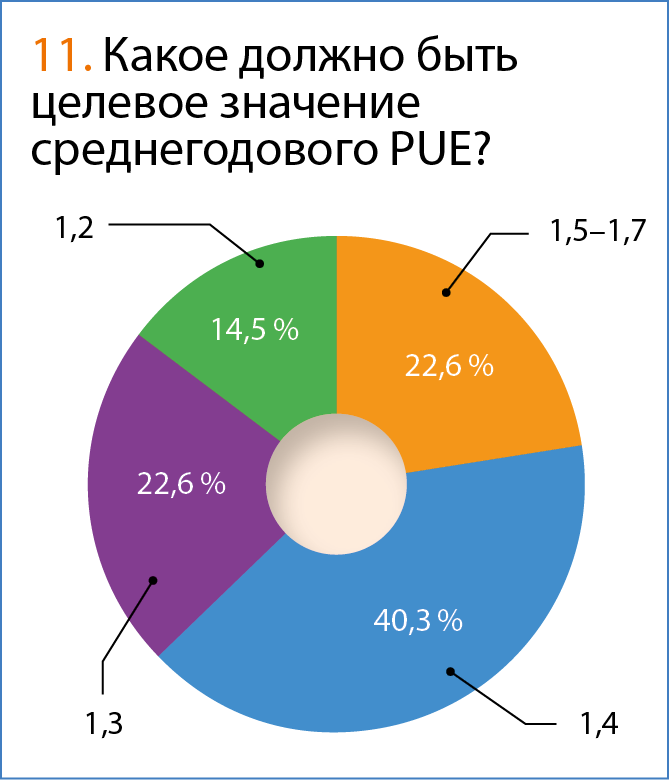 Вместе с тем вполне естественно, что все организации стремятся к использованию самых энергоэффективных решений и ожидают, что их КЦОД/МЦОД будет обеспечивать PUE на уровне 1,4 (40,3 %). Число тех, кто хотел бы добиться коэффициента 1,5–1,7 или 1,3, оказалось равным (22,6 %). В целом, это говорит о вполне адекватных ожиданиях заказчиков и понимании пределов и возможностей технологий КЦОД/МЦОД.