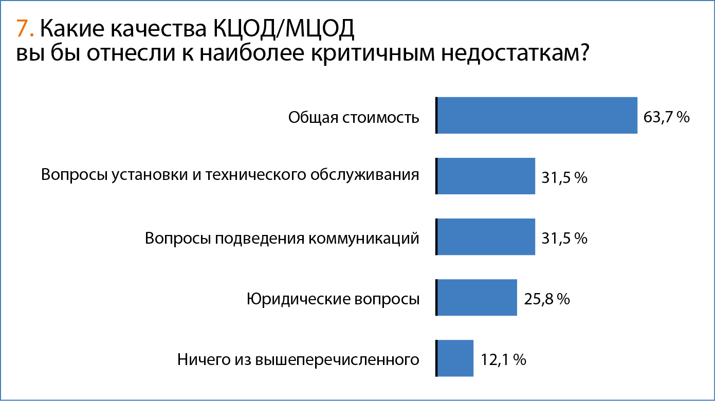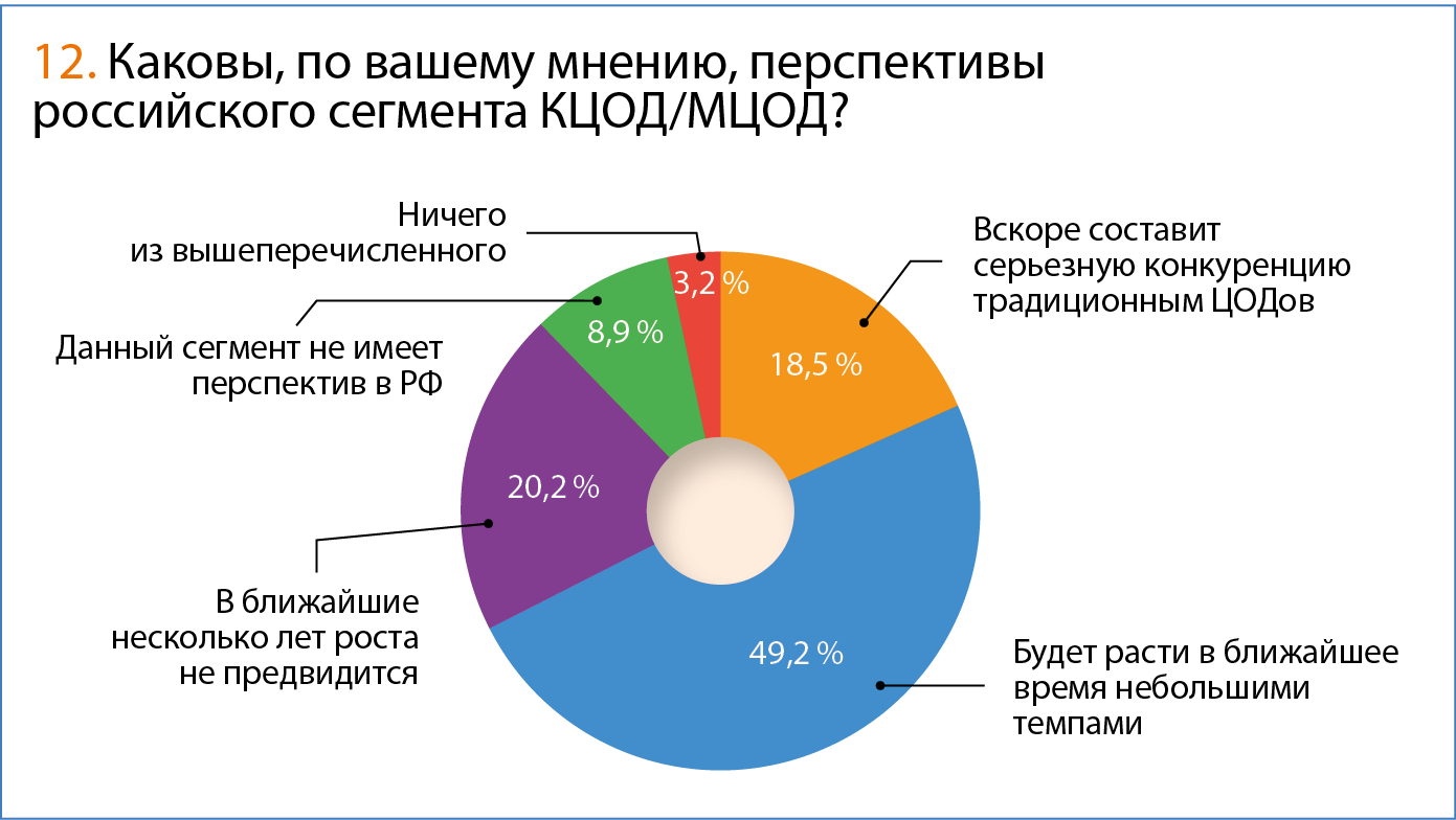 Хотя если к имеющимся 17,7 % тех, кто уже имеет КЦОД/МЦОД, добавить 40,3 % тех, кто планирует это сделать, получится, что большинство российских компаний склонны рассматривать такие решения в качестве актуальных. Это свидетельствует о положительных перспективах данного рыночного сегмента.