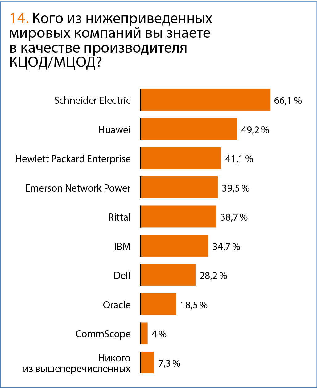 Из международных торговых марок однозначным лидером является Schneider Electric, следом идут Huawei и Hewlett Packard Enterprise. Удивительно, что в этом рейтинге HPE хоть немного, но все же обогнал Emerson, чьи позиции на рынке инженерной инфраструктуры ЦОДов все же сильнее. Очевидно, здесь сказалась общая маркетинговая политика производителя, впрочем, как и в случае с Huawei. В целом оказалось, что респонденты гораздо лучше знают зарубежных производителей — в число «малоизвестных» попала только одна компания CommScope.