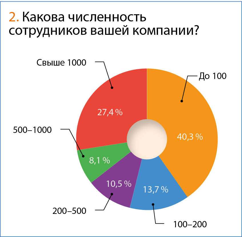 Однако, поскольку в опросе участвовали представители многих секторов экономики, выборка получилась вполне репрезентативной. При этом участвовали представители довольно крупных компаний: почти в 60 % случаев количество сотрудников превышает сто человек, а у 27,4 % отвечавших на вопросы организаций численность персонала превышает тысячу человек.