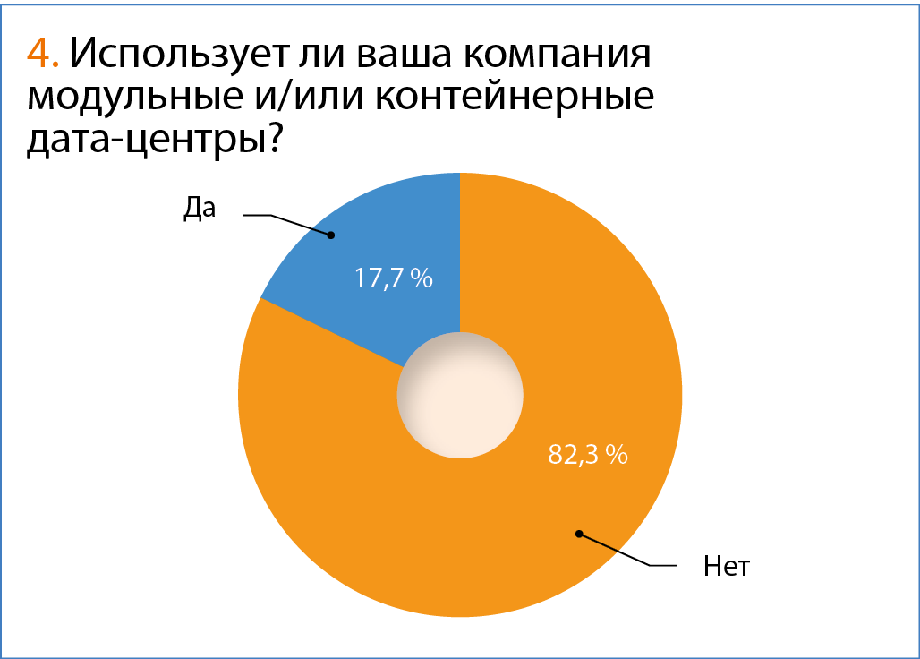 Собственный ЦОД имеют 59 компаний (47,6 %). При этом 17,7 % (22 респондента) используют контейнерные либо модульные решения. Такой процент уже можно назвать существенным, и он говорит о достаточно глубоком проникновении КЦОД/МЦОД в среду российских заказчиков.