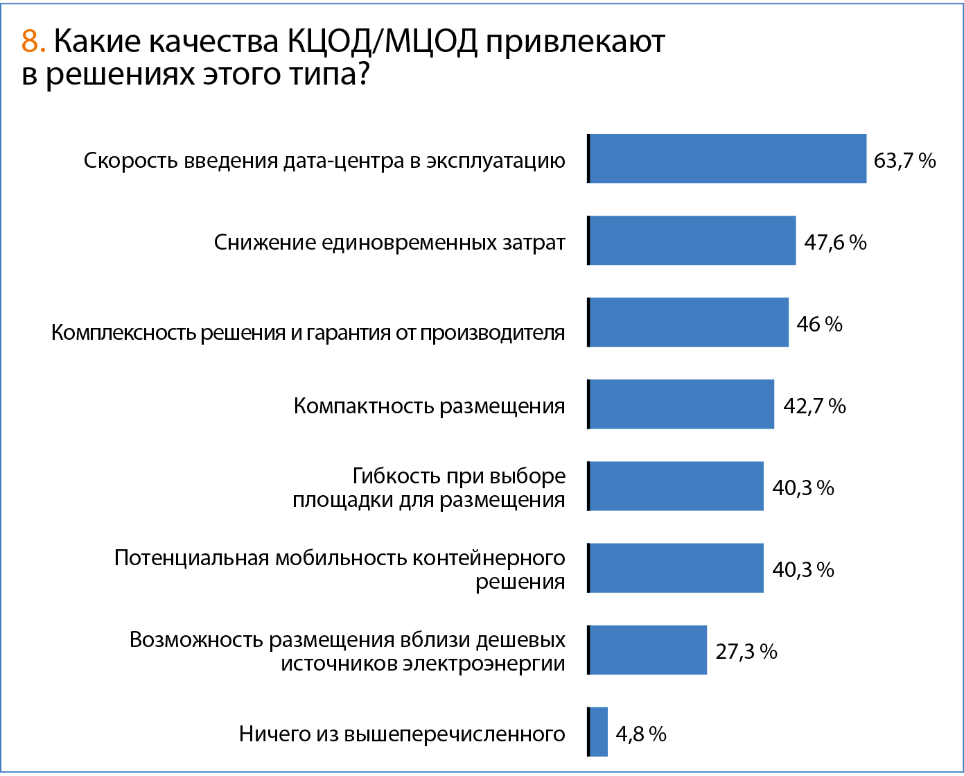 Что касается качеств, которые привлекают заказчиков, то это, в основном, скорость введения дата-центра в эксплуатацию (ей отдали предпочтение 63,7 % респондентов). Также большое значение имеют: снижение единовременных затрат (наращивание дата-центра по мере необходимости); комплексность решения и гарантия от производителя; компактность размещения; гибкость при выборе площадки; потенциальная возможность мобильности дата-центра.