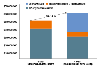 Компания DCD intelligence провела сравнение затрат на создание ДЦ мощностью 4 МВт в США (рис. 1). По ее расчетам, создание традиционного ДЦ обойдется заказчику на 13–14% дороже, нежели модульный вариант. Основное преимущество достигается за счет снижения затрат на монтаж и наладку оборудования. Следует обратить внимание, что непосредственно оборудование и ПО для модульного ДЦ существенно дороже.
