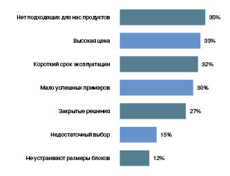 В 2012 г. Uptime Institute провел среди ИТ-специалистов опрос, попытавшись выяснить существенные, по их мнению, недостатки модульных решений. Наибольшее число респондентов (35 %) сообщили, что предложения вендоров недостаточны гибкие и не удовлетворяют их требованиям (рис. 2). Еще 33 % считают, что пока модульные ДЦ слишком дороги. 32 % опрошенных отмечают небольшой срок службы таких решений, 30 % указывают на новизну технологии и отсутствие достаточного количества реализованных проектов, а 27 % недовольны тем, что решения «залочены» производителем. Кроме того, 15 % респондентов сетуют на небольшой выбор продуктов, а 12 % не устраивает размер блоков.