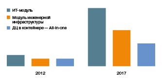 Согласно прогнозу, к 2017 году наибольший рост ожидает сегмент ИТ-модулей, наименьший — ДЦ в контейнере, All-in-one (рис. 4).