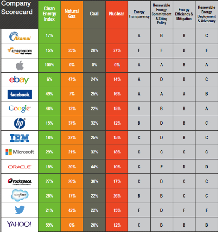Весной 2014 года Greenpeace выпустила доклад Clicking Clean («Чистое нажатие кнопки»). Понятно, что корпорации не могли в течение месяца исправить положение. Но экологи ожидали, что руководители хотя бы возьмут на себя обязательства увеличить объемы потребляемой электроэнергии за счет экологически чистых технологий.