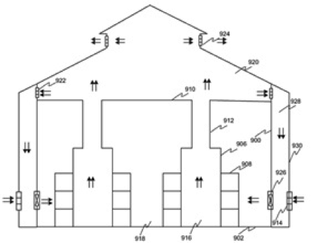 Вентиляторы, расположенные на стойках с компьютерным и сетевым оборудованием (908) втягивают холодный воздух из окружающего пространства (918), тянут его через оборудование в стойках и выпускают – уже теплый – во внутреннее пространство (916). Путем естественной конвекции использованный воздух поднимается вверх под крышу (920). Далее теплый воздух выходит вон из здания через регулируемые отверстия (924) в куполе крыши.