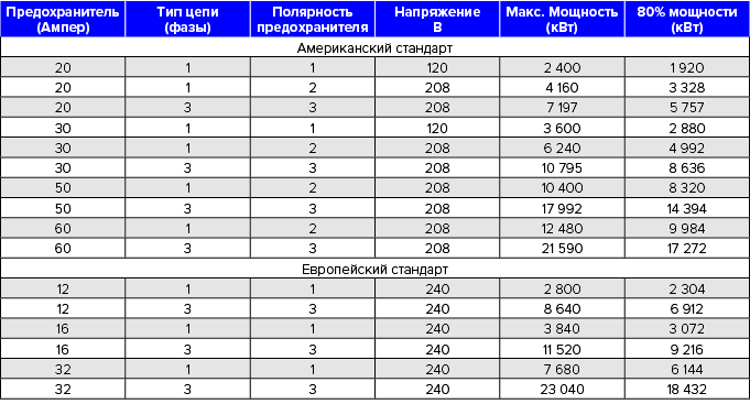 - Посмотрите на характеристики предохранителей на щитках параллельной цепи. Предохранители должны иметь нагрузку не более 80% от номинальной на постоянной основе. Используйте Таблицу 1 для определения максимальных возможностей контуров шкафа. Если ваши шкафы запитаны на спаренной схеме, максимальная нагрузка базируется на значениях одной из них.