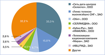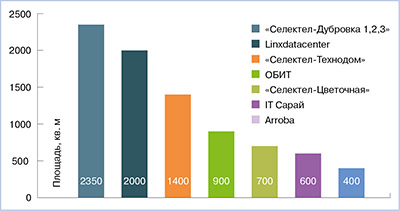 На рис. 2 представлены семь крупнейших КДЦ Петербургского региона (на 01.01.2013 г.). В этом перечне стоит выделить КДЦ, которым в 2012 г. удалось ввести в эксплуатацию крупные залы — «Дубровка-3», Linxdatacenter, ОБИТ — и таким образом укрепить свое лидерство. Отметим, что у трех КДЦ площадь составляет 1000 кв. м и более, а у шести — 500 кв. м и более.