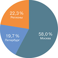 Каков объем общего предложения на рынке КДЦ России? Очевидно, он складывается из объема общего предложения на рынках КДЦ Московского и Петербургского регионов, а также обобщенной оценки объема общего предложения на региональных рынках КДЦ РФ. Первые два значения нам уже известны, а последнее, по нашим оценкам, составляет порядка 15 000 кв. м (на 01.01.2013 г.). Тогда объем общего предложения на рынке КДЦ России составит порядка 67 300 кв. м, в этом случае на рынке Московского региона сосредоточено 58 %, Петербургского региона — 19,7 %, а на региональных рынках — 22,3 % объема общего предложения на рынках КДЦ РФ (рис. 3).
