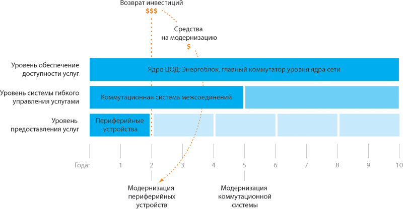 Ядро ЦОДа – это, как правило, энергоблок, главный коммутатор уровня ядра сети, - он создается на 10лет. Вокруг строится уровень распределения на срок 5 лет. После этого решается вопрос с серверами, жизненный цикл которых - 2 года.