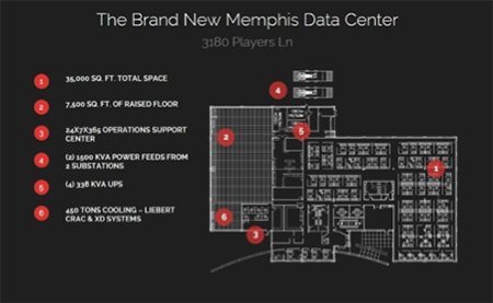 Здание в Мемфисе имеет общую площадь 3 200 кв. м, площадь фальшпола – 700 кв. м. Волоконно-оптическое соединение 10 Гб/с связывает его с другими десятью дата-центрами Expedient.