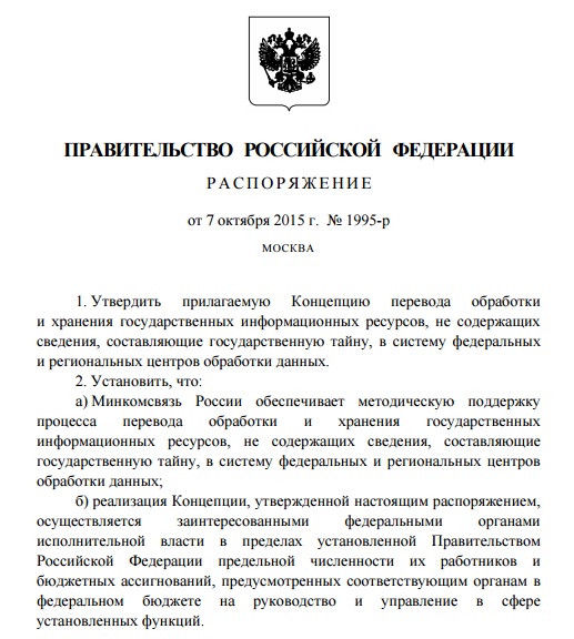 7 октября 2015 года Председатель Правительства России Дмитрий Медведев подписал концепцию «перевода обработки и хранения государственных информационных ресурсов, не содержащих сведений, составляющих государственную тайну, в систему федеральных и региональных центров обработки данных».