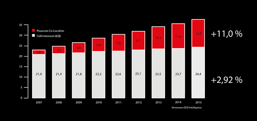 Популярность среди компаний размещения, эксплуатации и подключения к сети технической инфраструктуры в вычислительных центрах сторонних поставщиков услуг (совместное размещение) с 2007 года значительно выросла по сравнению со строительством собственных ЦОД. Развитию этой тенденции способствуют новые технические разработки и возможность сократить таким образом затраты на ИТ.