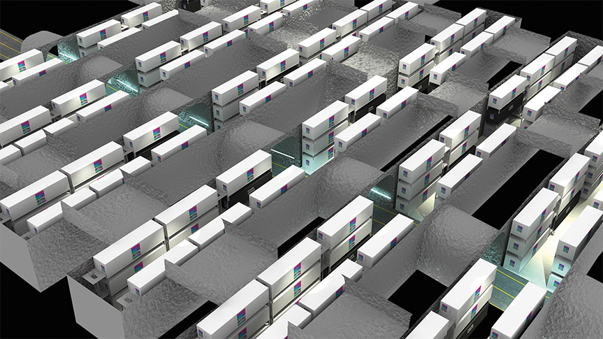 ТРИ УРОВНЯ НА ЭТАЖ: ширина улиц позволяет размещать контейнеры с оборудованием обеспечения безопасности на обеих сторонах. Поскольку высота отдельных уровней достигает 18 м, контейнеры на 12 стоек можно устанавливать друг на друга в три этажа. Также возможно возведение бетонированных трехэтажных конструкций площадью до 2500 кв. м.