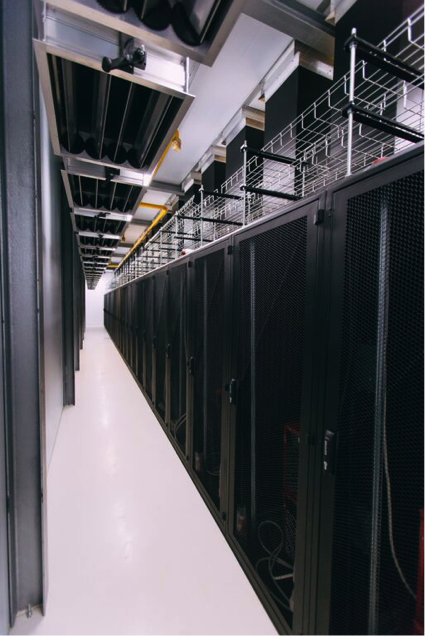 Установленная мощность дата-центра — 1,65 МВт. Надежность электроснабжения обеспечивают два независимых фидера. Система гарантированного электропитания включает три дизель-роторные установки (Diesel Rotor UPS, DRUPS) производства Hitech, подключенные по схеме 3/2 N. Эти системы используются не только для электропитания критической ИТ-нагрузки, но и для систем охлаждения, автоматики и контроля доступа. Топливные баки рассчитаны на 24 часа непрерывной работы дизелей. Система распределения питания полностью построена на шинопроводах.
