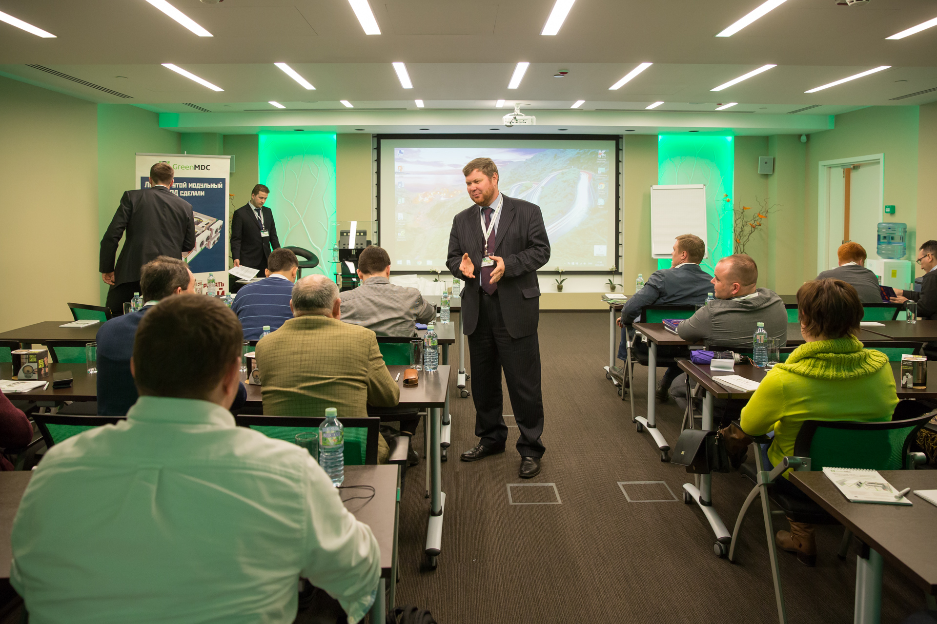 Спикерами конференции выступили Игорь Дорофеев, консультант и преподаватель, президент Ассоциации участников отрасли ЦОД, и Федор Клименко, руководитель компании GreenMDC. Также в мероприятии приняли участие технический и коммерческий директора компании Михаил Филиппов и Георгий Малышев, которые помогали участникам конференции найти ответы на узкоспециализированные вопросы.
