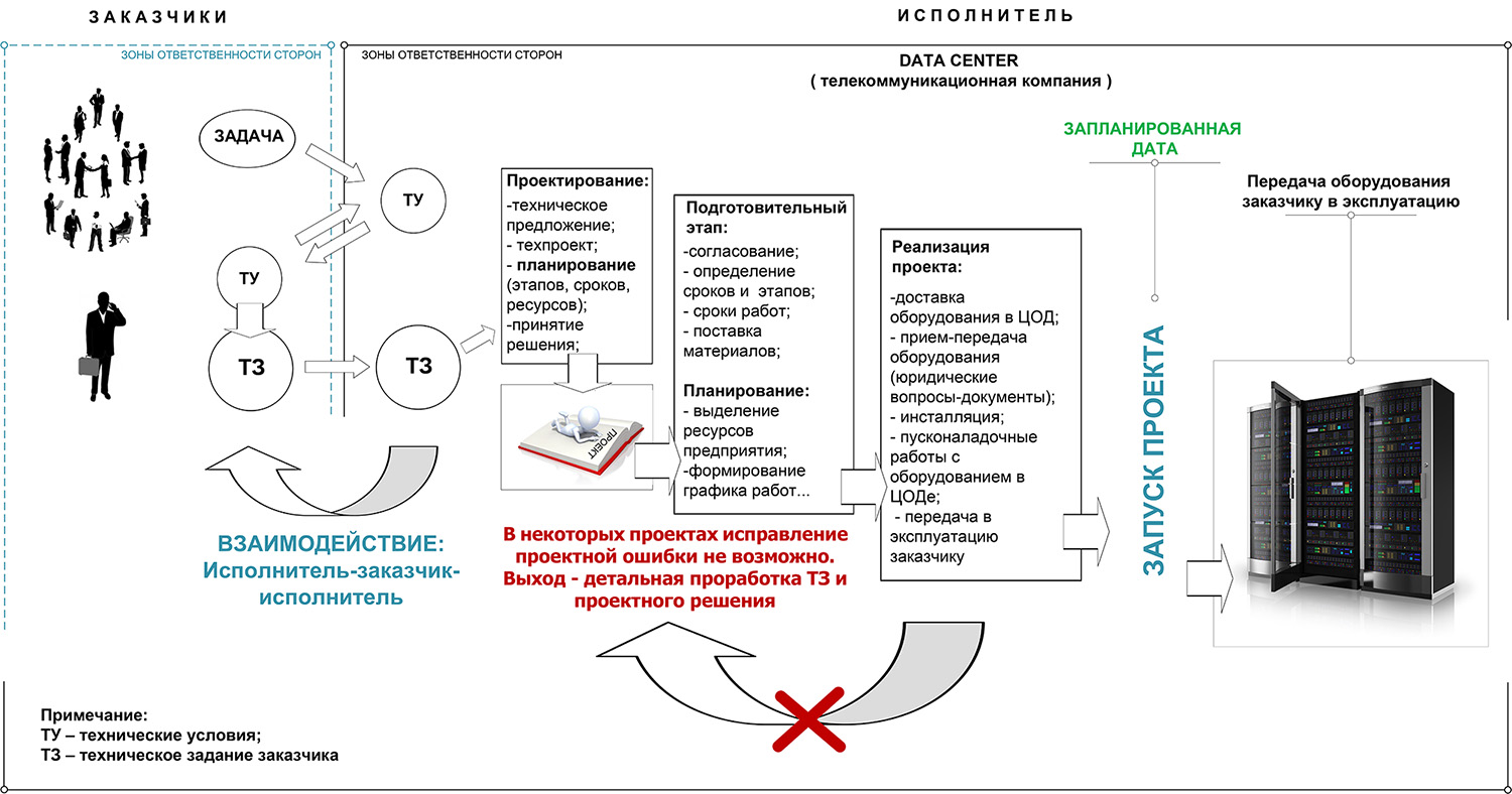 Предлагаю подробнее рассмотреть вопрос цели. Цели как реализации проекта, состоящего в установке оборудования в ЦОДе и запуске этого оборудования в назначенные сроки. Ниже приведена упрощенная схема, отражающая связи между различными этапами «достижения цели». Разумеется, в зависимости от предоставляемых ЦОДом услуг и бизнес-процессов компании-заказчика зоны ответственности сторон в разных проектах могут различаться.